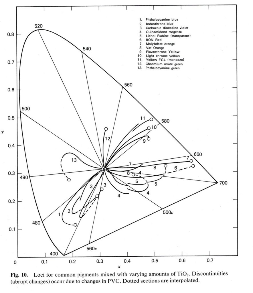 To visualize this sort of interesting “flight” path projected into a chromaticity projection, we can look at the complex flights of paints. Dr. David Briggs graciously provided a sample from Pigment Handbook, Volume 3: Characterization and Physical Relationships, Second Edition: