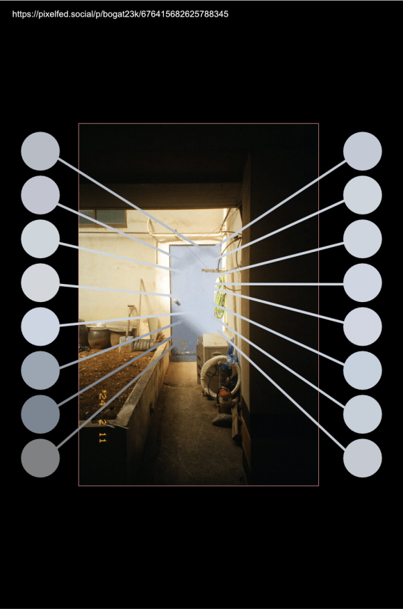 Here I’ve sampled a good smattering of discrete pixel stimuli intensities, and isolated them in an increment orientation toward the sides of the depiction. We can get a sense that the colour we effortlessly thought we passively “saw” in the stimuli, is simply nowhere to be found! It turns out that for most folks no satisfactory “match” can be derived, regardless of which stimuli sample we choose. For many folks, none of the swatches carry the cognition of “blueness” that is present in the articulation of the door.