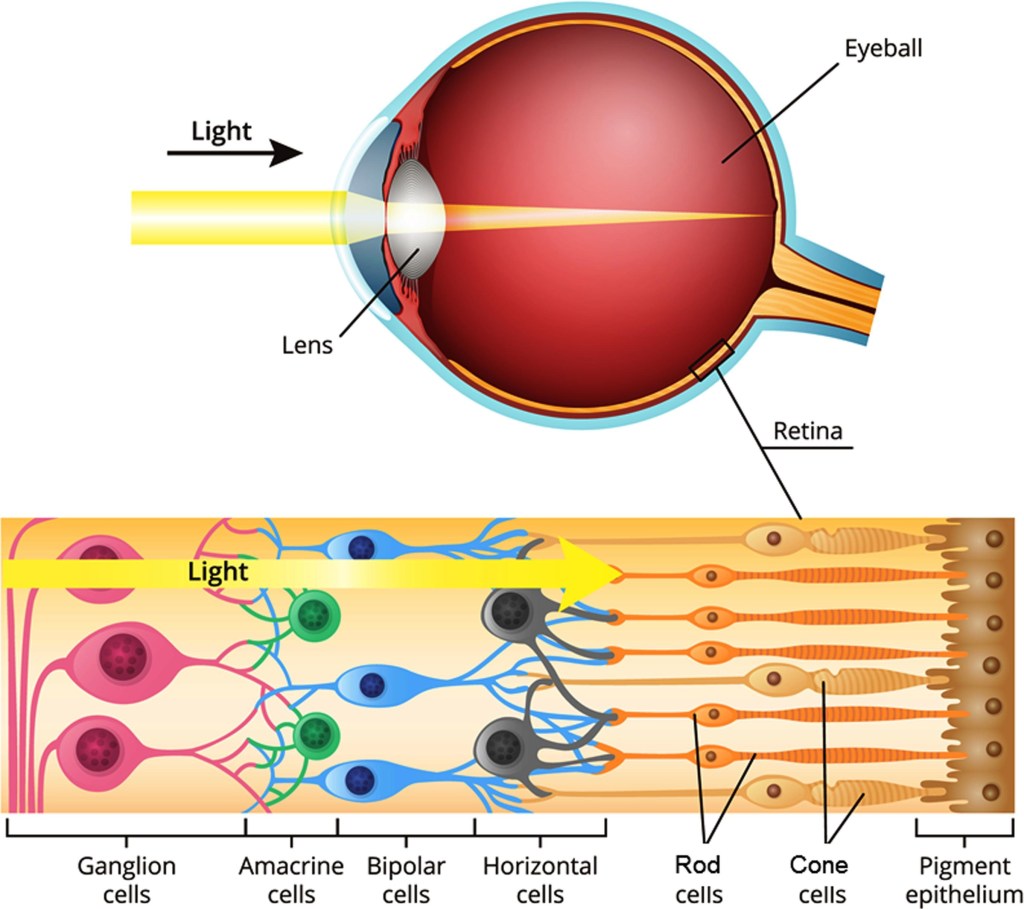 When we look at a breakdown of the retina, the part of our biology we are initially interested in are the rods and cones. The following diagram, borrowed from Moos et al.2, shows us the relative position of the rods and cones.