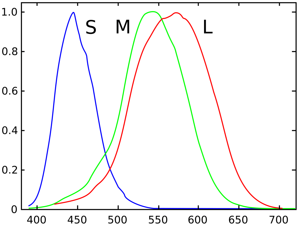 Hopefully most readers here have a bit of an inclination as to why this ridiculously impoverished and reductionist framing of colour cognition is complete bullsh*t. Do the cones broadly respond to a specific range of electromagnetic radiation? Yes. Is there some sort of “neural quantification” of this signal directly from the rods and cones? No. Is “colour” “contained” in the sensitivities that this plot describes? F*ck no.
