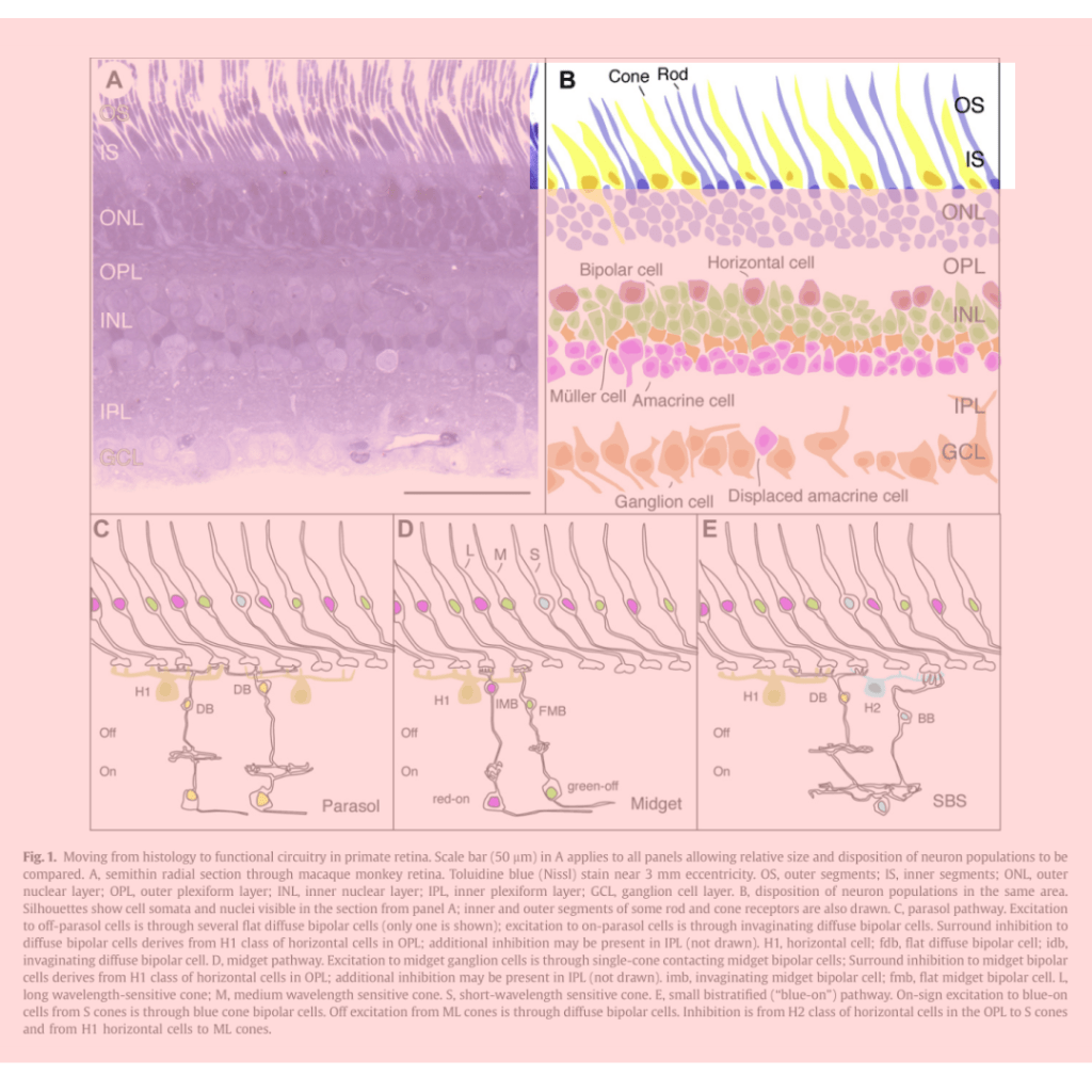 If we are to discuss stimuli’s relationship to energy, and forward a colourimetric world view ideology, we are effectively falsely reducing the above retinal depiction from Danilova and Mallon4 to the small cropped region. Imagine trying to convince people to ignore what amounts to the totality of the visual cognition system and focus strictly on an absorptive profile of the cones as “colour”!