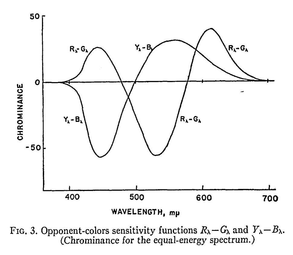 Why is it important to think about wattage? Sure, relative wattage is a heck of a useful way to realize that RGB values “work” in PBR rendering because they are just that — units of wattage! But what relation does external energy have in relation to our complex colour cognition machinations? How does this elucidation of wattage, and the Boynton / Judd / Müller twin chrominance signals relate to broader mysteries of colour cognition?