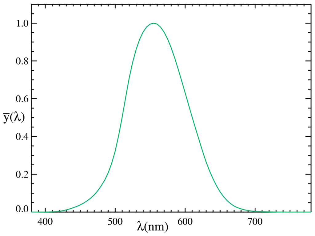 1924 signifies a leap forward in terms of colourimetric stimuli specifications because this5 is the origin date of the standard that became “the” luminous efficacy function. This function is what becomes the baseline of all colourimetry to follow for over a hundred years. That’s this plot, borrowed from Wikipedia.