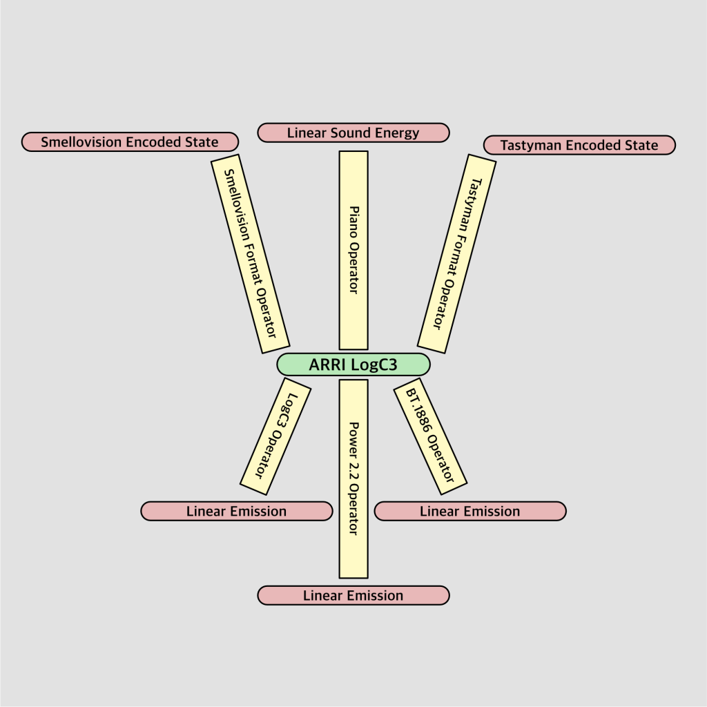 For example, a rendering person might want to know some sort of proportionate signal response to emulate what a modelled display screen in their renderer would emit as a texture, in relative energy terms. What then is the correct operator here? Would it be the BT.709 transfer characteristic, inversely decoded? Would it be the BT.1886 transfer characteristic applied to the encoded values? Or would it perhaps be the inverse of the Arri transfer characteristic which played a role in the pictorial depiction? Which one is correct??? We shall leave the answer to the readership, who it is with great confidence will deduce the proper operator.